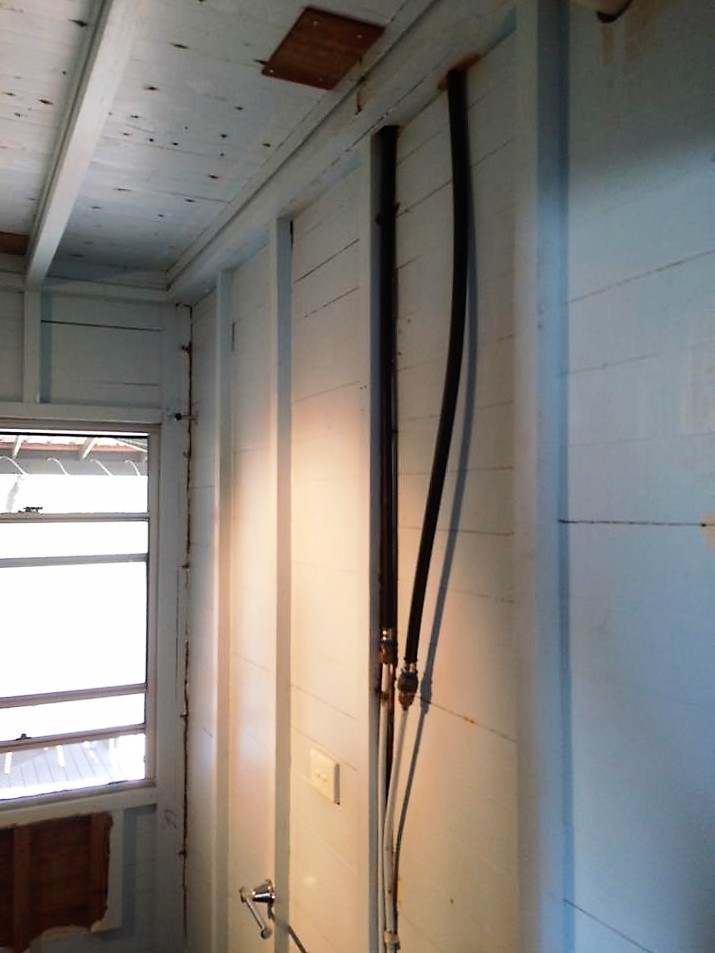 We have started a new bathroom renovation for a lovely couple in Morayfield. Whilst the bathroom looks small it will have a shower/bath, vanity and toilet. The bathroom has been completely stripped down right down to removing the floor boards, only to discover that the joists are rotten and need to be replaced. We have fixed up the floor, the electrician and plumber have been hard at work today.